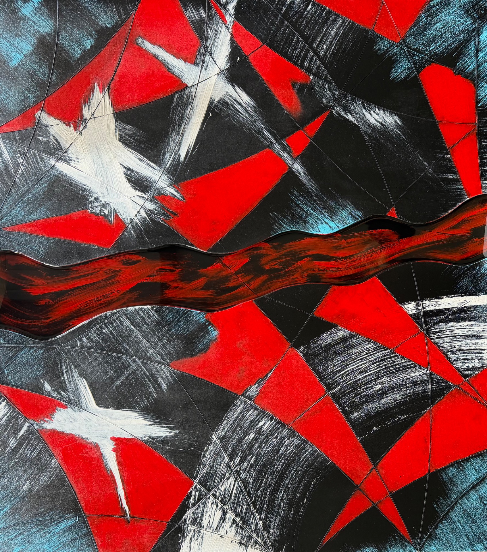 ANNO 2026 MISURE 80X71 CM  TITOLO "EQUILIBRIO INFRANTO" TECNICA MISTA SU PANNELLO MDF CON INSERTO CENTRALE IN RESINA EPOSSIDICA TRASPARENTE